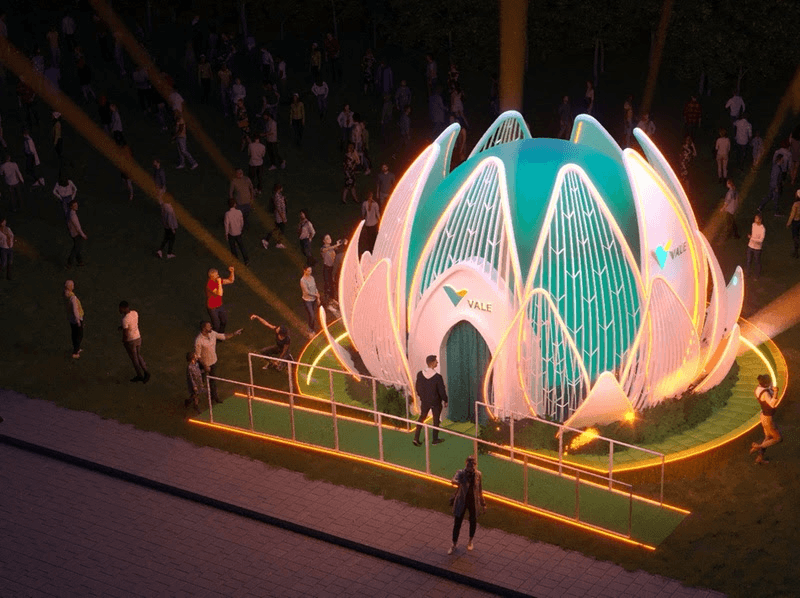 O espaço da mineradora, com dez metros de diâmetro e cinco de altura, terá imagens, sons, aromas e elementos visuais que simulam a biodiversidade amazônica. À noite, a estrutura ganha iluminação dinâmica inspirada nas cores da vitória-régia, flor que também serviu de referência para o design do estande.
