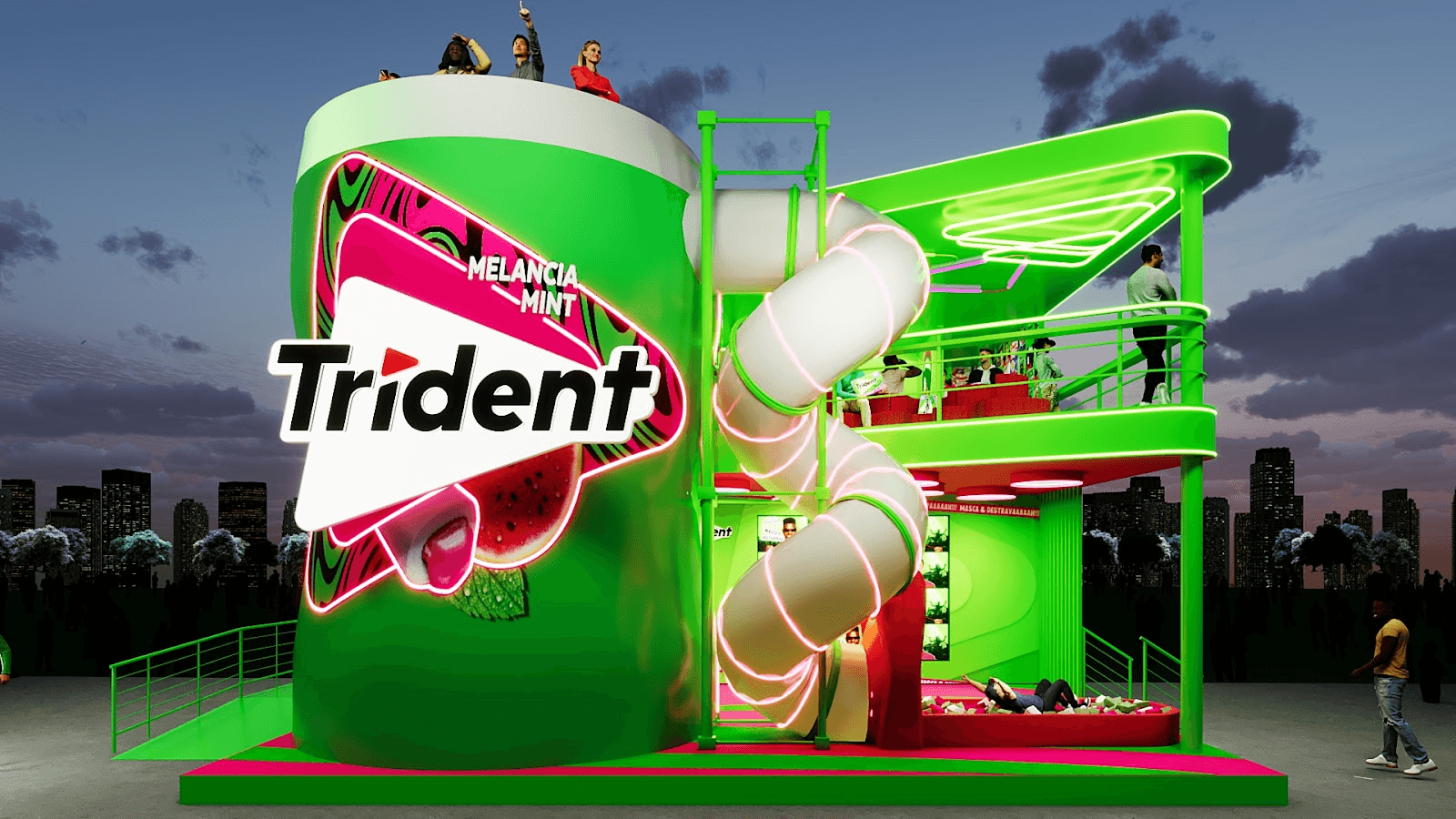 O estande de Trident no The Town 2025 será um convite à interatividade. Ocupando 100 m² e inspirado em todos os elementos da marca: a experiência de subir no topo de um Trident X Senses gigante e descer pelo tobogã em formato de boca, aroma de menta por todo o ambiente, a cor verde menta, um mezanino panorâmico para fotos das alturas em formato de embalagem, além de uma cabine fotográfica para eternizar as memórias.