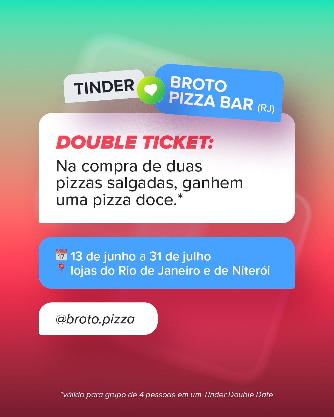 Em São Paulo, a Paul’s Boutique oferece uma pizza ou sobremesa extra do mesmo sabor para duplas com match no Double Date que fizerem um pedido. No Rio de Janeiro e em Niterói, a Broto Pizza presenteia com uma pizza doce gratuita na compra de duas pizzas salgadas, enquanto durar a promoção.