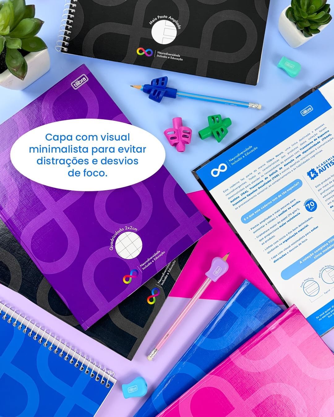 Visando atender pessoas com necessidades específicas de adaptação, a Tilibra lançou uma linha de cadernos desenvolvida especialmente para alunos com condições atípicas, como o TEA - Transtorno do Espectro Autista, o TDAH - Transtorno de Déficit de Atenção e Hiperatividade, o TOD - Transtorno Opositivo Desafiador, entre outros.