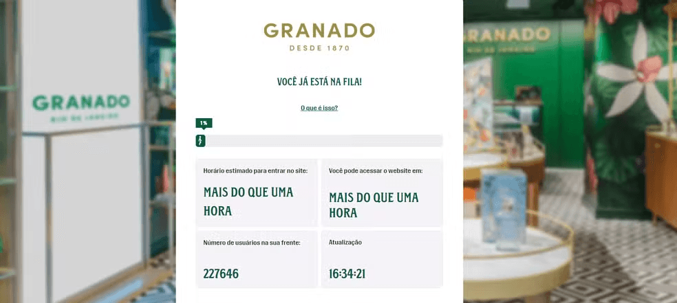 Com isso, o site da Granado ficou congestionado, gerando uma fila de espera virtual com mais de 150 mil pessoas. Nas redes sociais, as pessoas relataram estar há mais de quatro horas aguardando. A marca chegou a emitir um comunicado sobre o ocorrido. “Apesar de termos nos preparado para um grande volume de vendas, o sucesso da Semana Granado foi maior do que o esperado. Isto ocasionou uma instabilidade em nosso site. Lamentamos pela experiência e estamos trabalhando muito para solucionar a situação o mais rápido possível!”, avisaram.