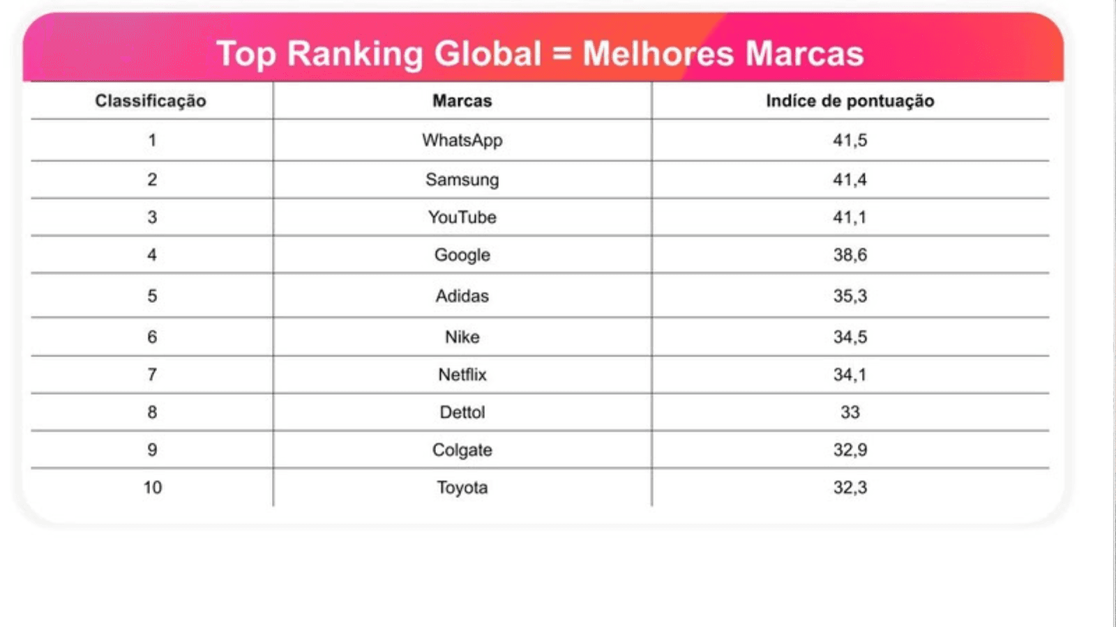 Natura (5ª), Netflix (6ª) e Colgate (7ª) permanecem entre as mais bem avaliadas pelos consumidores no país. O WhatsApp (10ª), líder global, figura entre as dez primeiras posições no Brasil, refletindo sua ampla penetração e relevância no uso diário.
