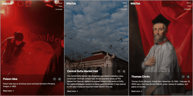 No WikiTok, os usuários acessam resumos de artigos da Wikipédia em um feed infinito, com imagens e links para leitura completa. Diferente das redes sociais tradicionais, o site não usa algoritmos para recomendar conteúdo baseado no histórico do usuário, permitindo descobertas aleatórias e inesperadas.